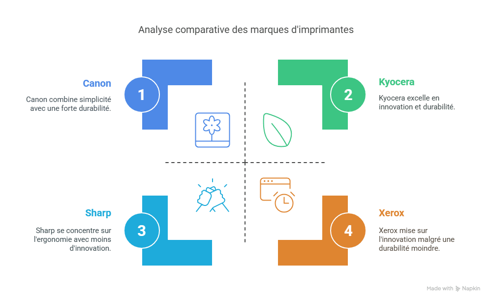 Les marques Canon, Ricoh, Xerox, Kyocera, et Sharp dominent le marché des photocopieuses professionnelles en 2025.